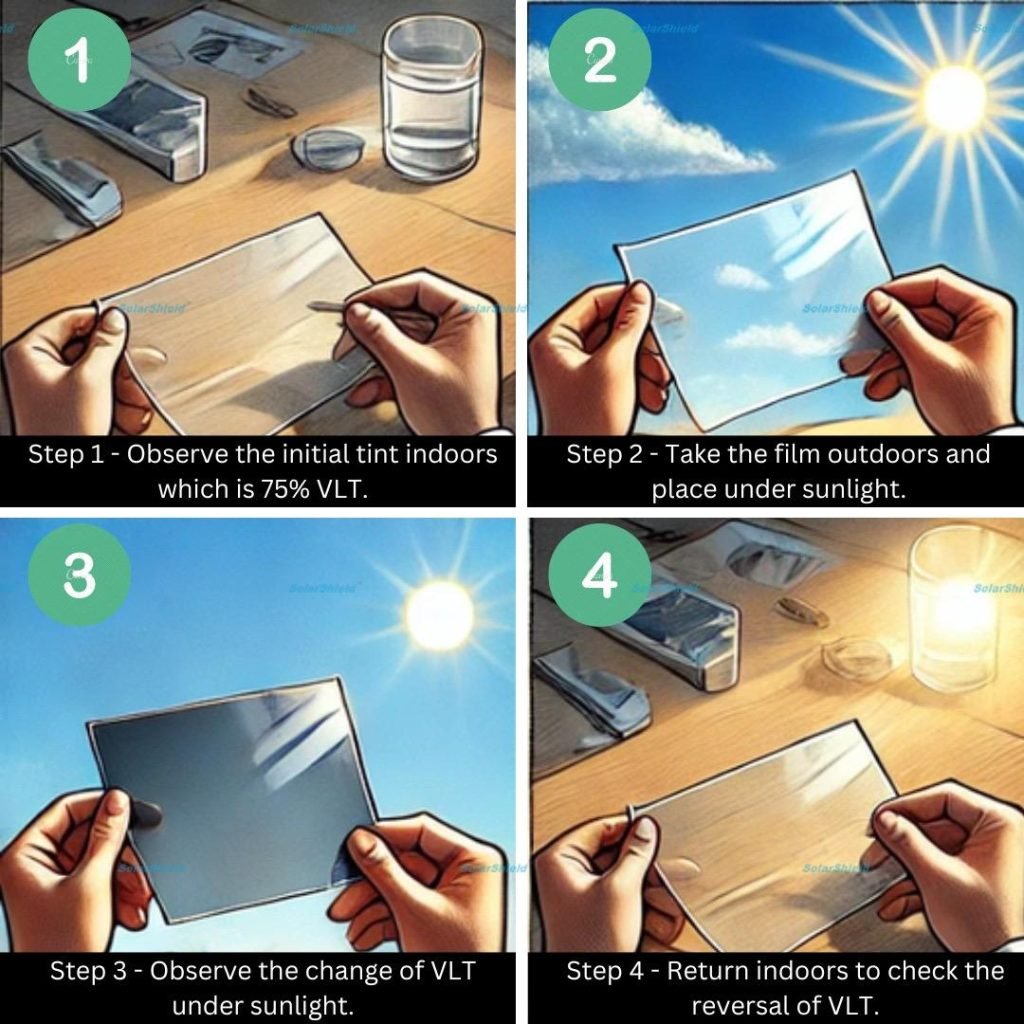 Return Indoors to Check Reversal of VLT – Bring the film back indoors and observe as it lightens again when the film is moved away from sunlight.